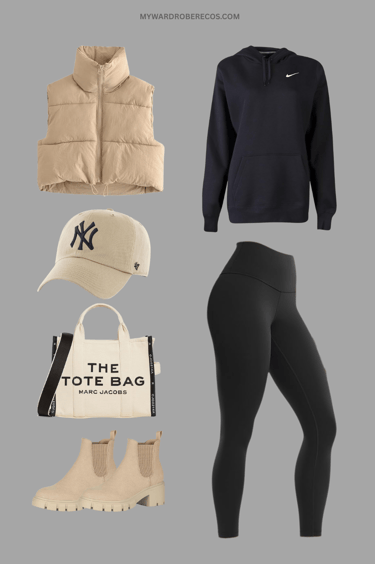 Fall fashion is all about layering—mixing comfort with elevated details. This outfit strikes the perfect balance: sporty yet polished, relaxed but still put-together. Black leggings and a navy hoodie create the sleek base, while the beige puffer vest, matching cap, and neutral Chelsea boots add texture and warmth. Finished with a structured tote bag, this look is ideal for chilly morning errands, weekend outings, or a laid-back coffee date.