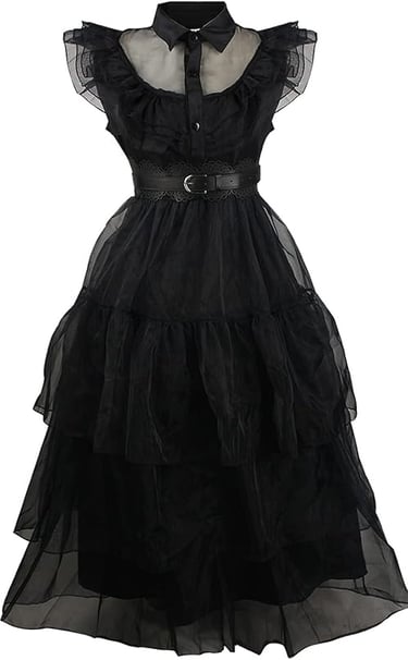 A layered, ruffled black dress with a crisp collar. Helpful for capturing Wednesday’s moody, mysterious essence while staying polished.