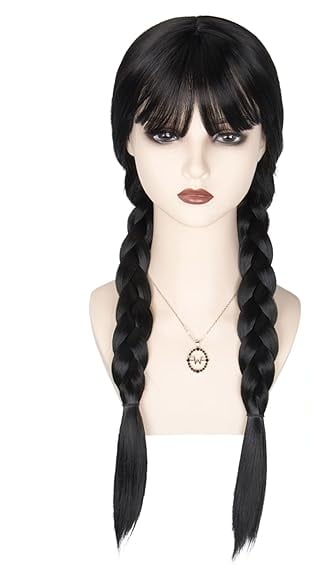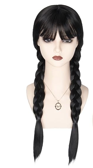 Long black wig styled into Wednesday’s iconic braids. Helpful for nailing the instantly recognizable Addams Family look.